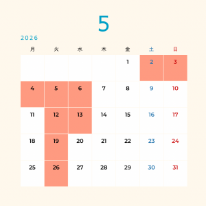 投稿日: 2026年4月20日2026年4月1日☆GW中の休業日のお知らせ☆ 〇GWの休業日 平素は格別のお引き立てをいただき厚く御礼申し上げます。誠に勝手ながら、下記日程を休業いたします。 休業期間 5月2日(土)~6日(水) 皆様には大変ご不便をおかけいたしますが、何卒ご理解のほどお願い申し上げます。